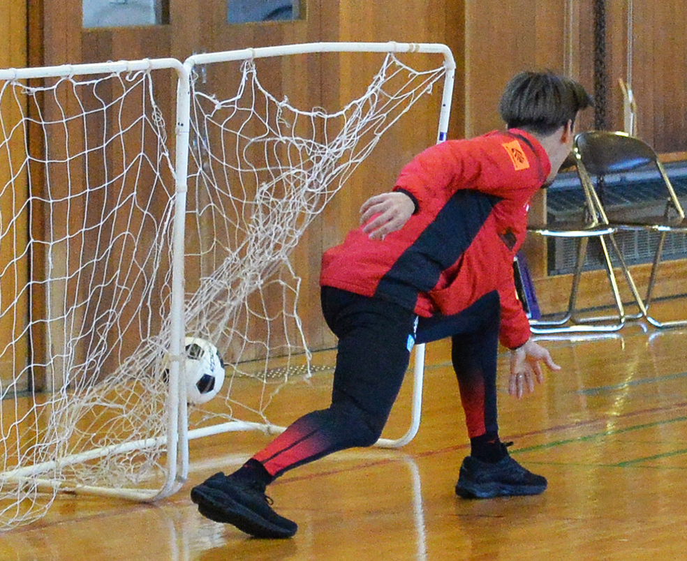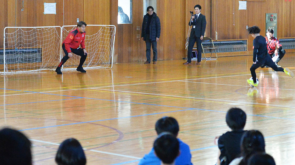 13時過ぎに一行は中標津町立丸山小学校へ到着。4~6年生約130人から熱烈な歓迎を受け、まずサッカー少年団の子供たちとPK対決を実施。当初はミニゴール1台で行う予定だったがゴールが小さいため、高木の提案で急きょゴールを2台つなげることに。プロのGKの技を見せる場面もあったが、2人の児童にゴールを許し「全部止めようと思ってましたが決められてしまったので、これから帰って練習します!帰ります!」とジョーク混じりに感想を伝えると、体育館内に「えーっ!」と大きな声が響き渡った。次に行われたドリブルゲームでは、開始前に実技を披露しながらコツを説明。ゲームが始まると高木は行く手をジャマしに各組を巡回。児童たちと笑い合いながらゲームを楽しんだ。