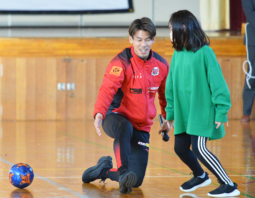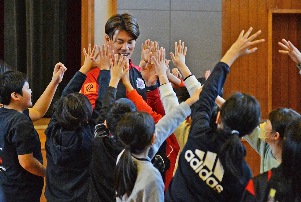司会の先生からの質問に答える形で行われたトークコーナーでは、3歳のときにJリーグが開幕し、父親もサッカー好きだったことから幼稚園児の頃にサッカーを始めたとエピソードを披露。小学生時代の夢について「小さい頃からサッカー選手になりたいと思っていました」と語り、「夢をかなえるためには『かなえるんだ』という思いの強さが大事」と、次代を担う児童たちにアドバイスを贈った。