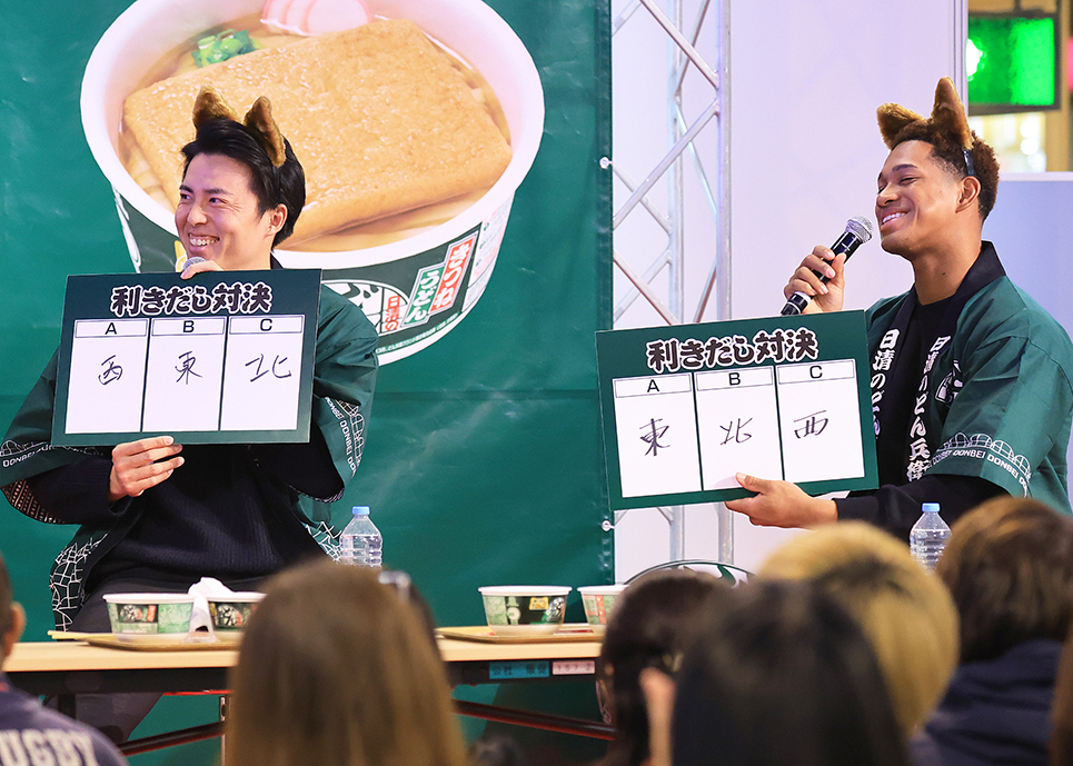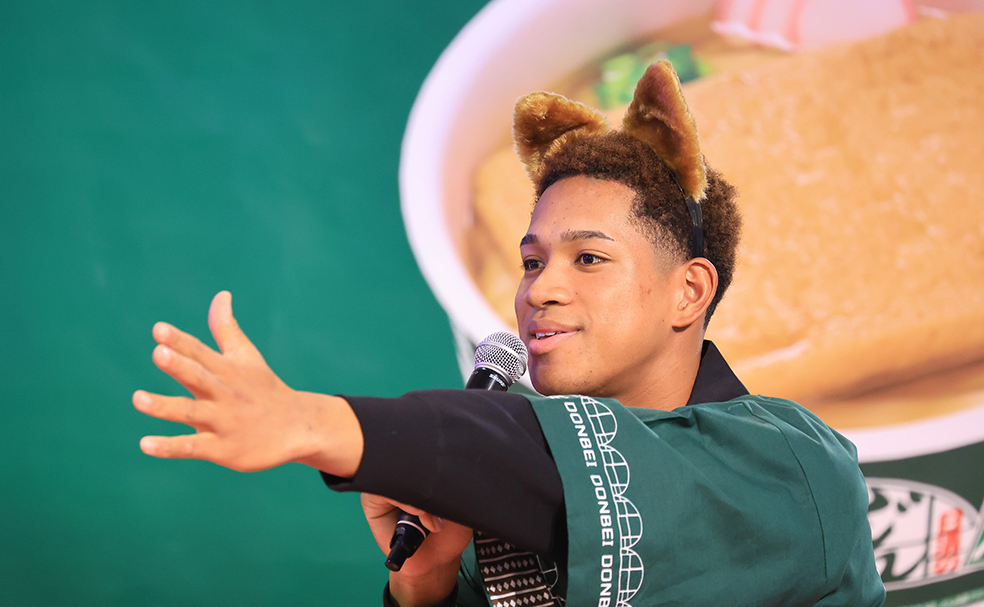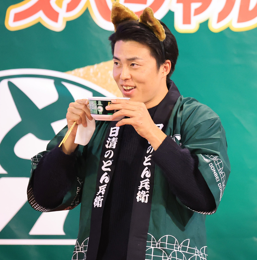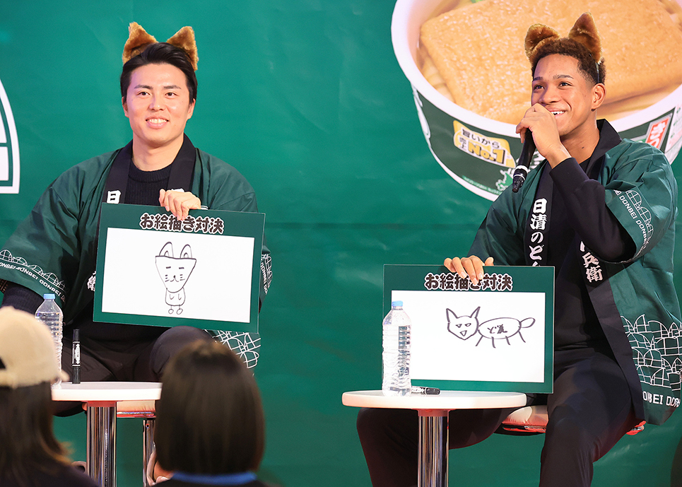 〝どんぎつね〟の耳を付けた可愛らしい姿で、ファンとの束の間の交流を楽しんだ。イベントにちなんで「来季〝どん〟と来そうな選手」を問われた万波は「ドラフト1位で入ってくる細野投手。映像を見るとエグい。大活躍すると勝手に思っています」と回答した。