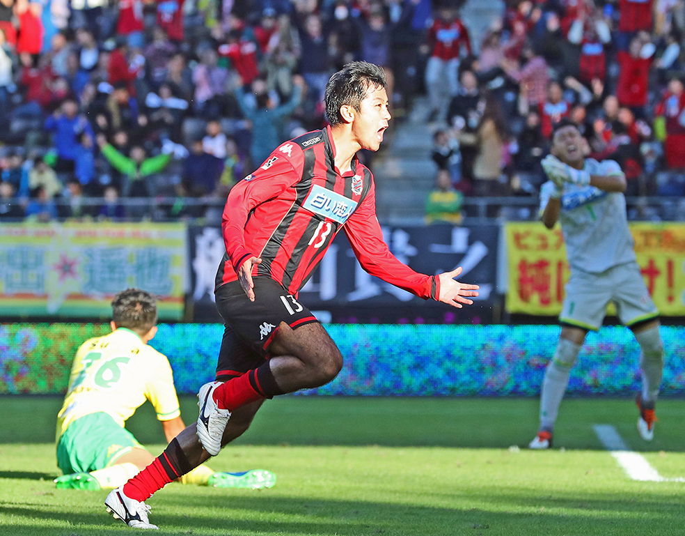 2016年11月12日のJ2千葉戦、後半アディショナルタイムにFW内村が決勝ゴールを決めて喜びを爆発させる