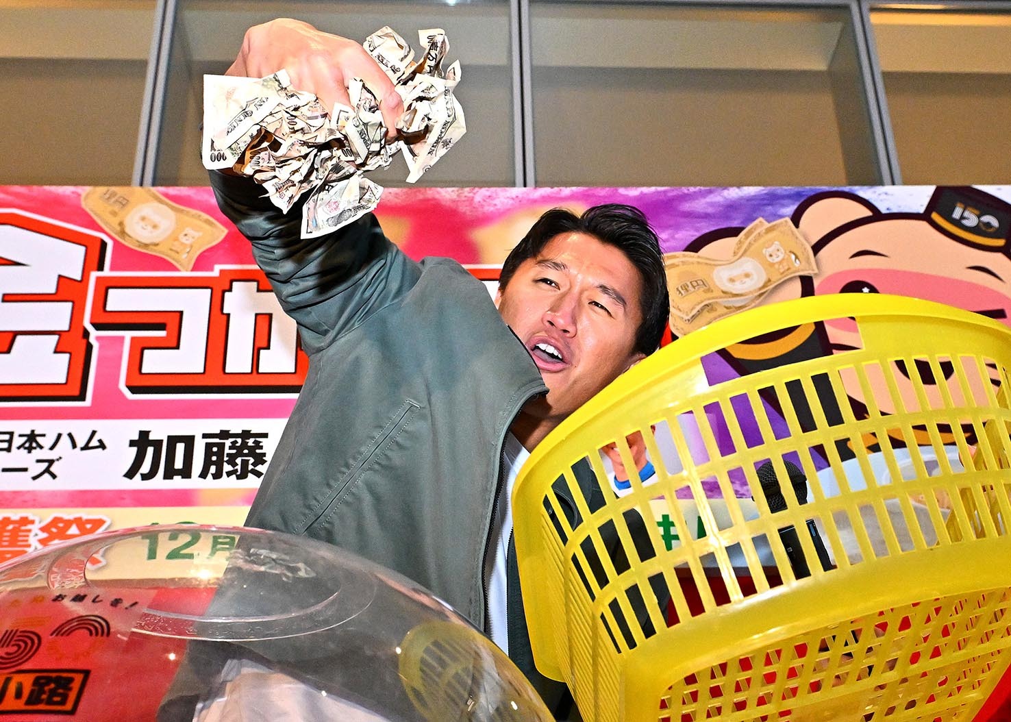 透明な球体の容器に入ったお札を30秒間で何枚つかめるかー。過去に参加した選手の最低記録はバラエティー担当だったOB杉谷氏の36枚。米国育ちの加藤豪は事前にYouTube動画などで研究を積み「目標は37枚です!」と臨んだ。