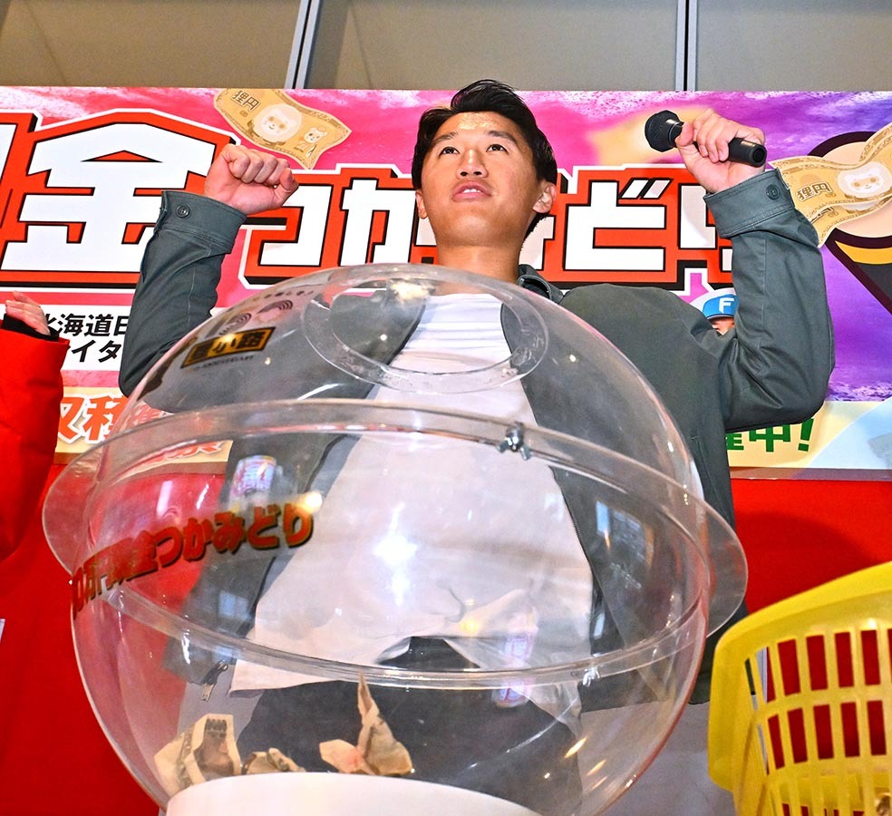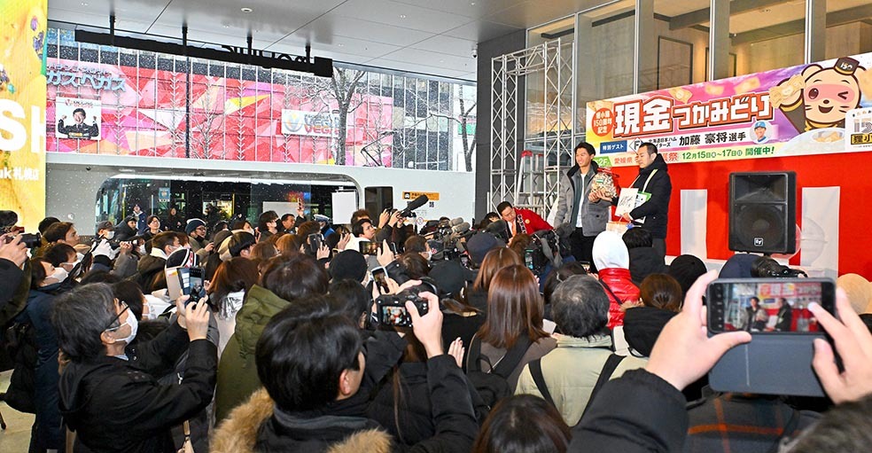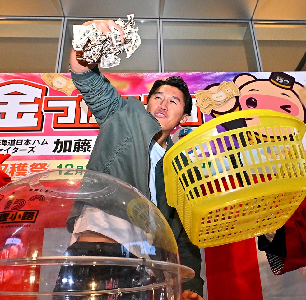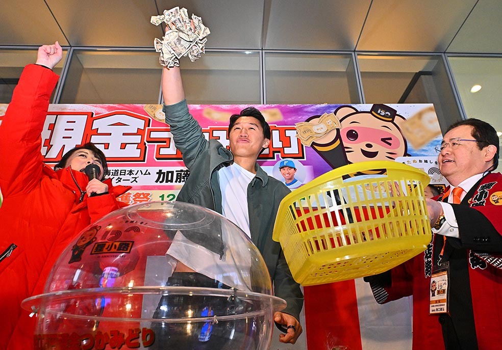 日本ハムの加藤豪将内野手(29)が16日、札幌市内の狸小路商店街で行われた「狸小路150周年記念現金つかみどり」に〝助っ人〟として登場。4年ぶりに復活した年末恒例イベントを大いに盛り上げ、「4年ぶりで150周年で。プレッシャーが、かかったんですけど、楽しんでできました」と満面の笑みを浮かべた。