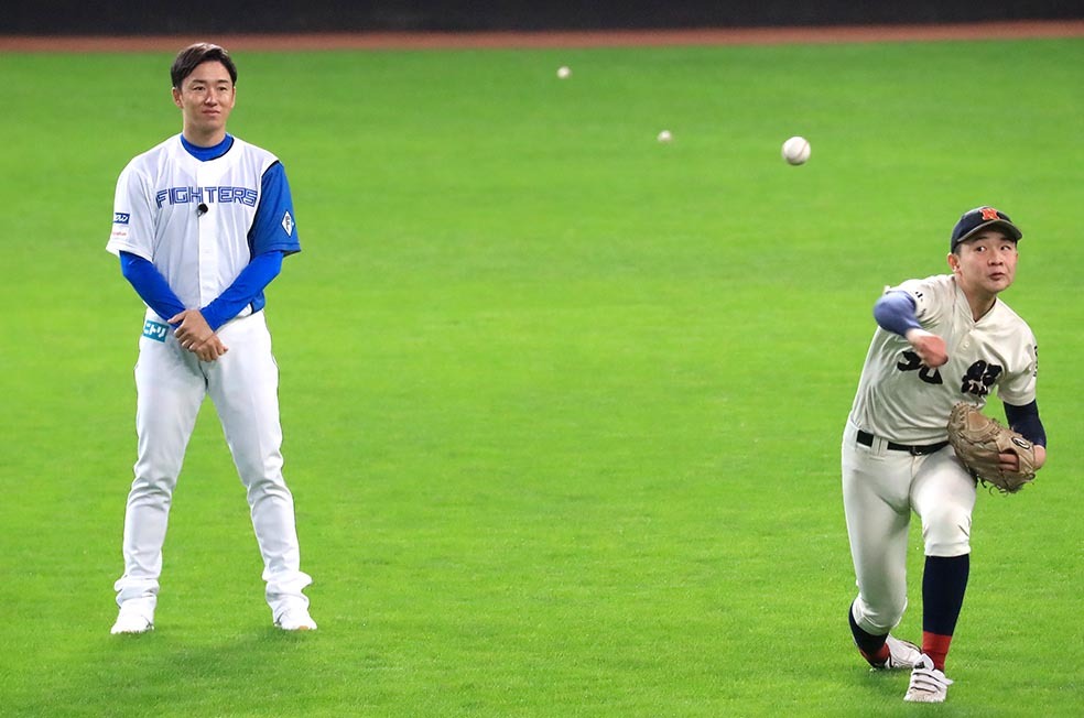 佑ちゃんが日本ハムのユニホームでエスコンフィールドに降り立った。外野芝生エリアでキャッチボールをしていた北照のエース・田中大晟投手(2年)に近寄り、身ぶりを交え熱心に指導。ブルペンにも足を運ぶなど積極的に動き回った。