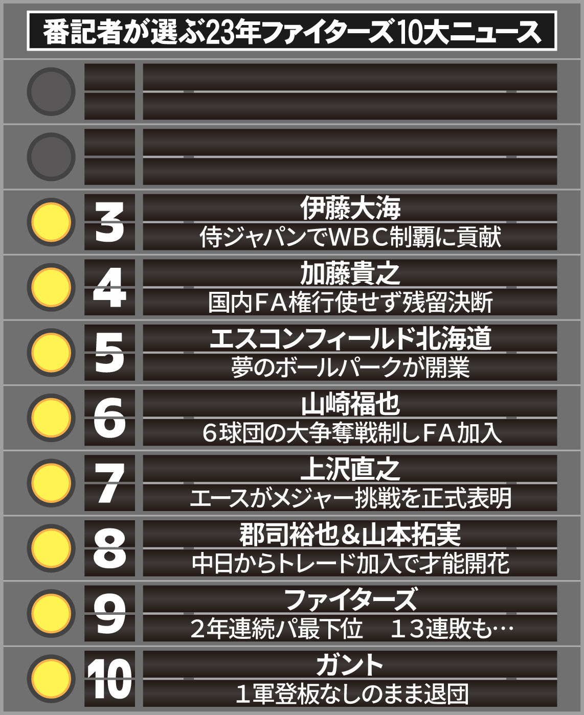 日本ハム担当の番記者たちが思い入れ重視で勝手に選んだ今季の名シーン、出来事をランキング形式で振り返る「2023 F10大ニュース 番記者が勝手に選定~写真とともに振り返る~」。第2回は6位から3位をお届けする。(全3回)