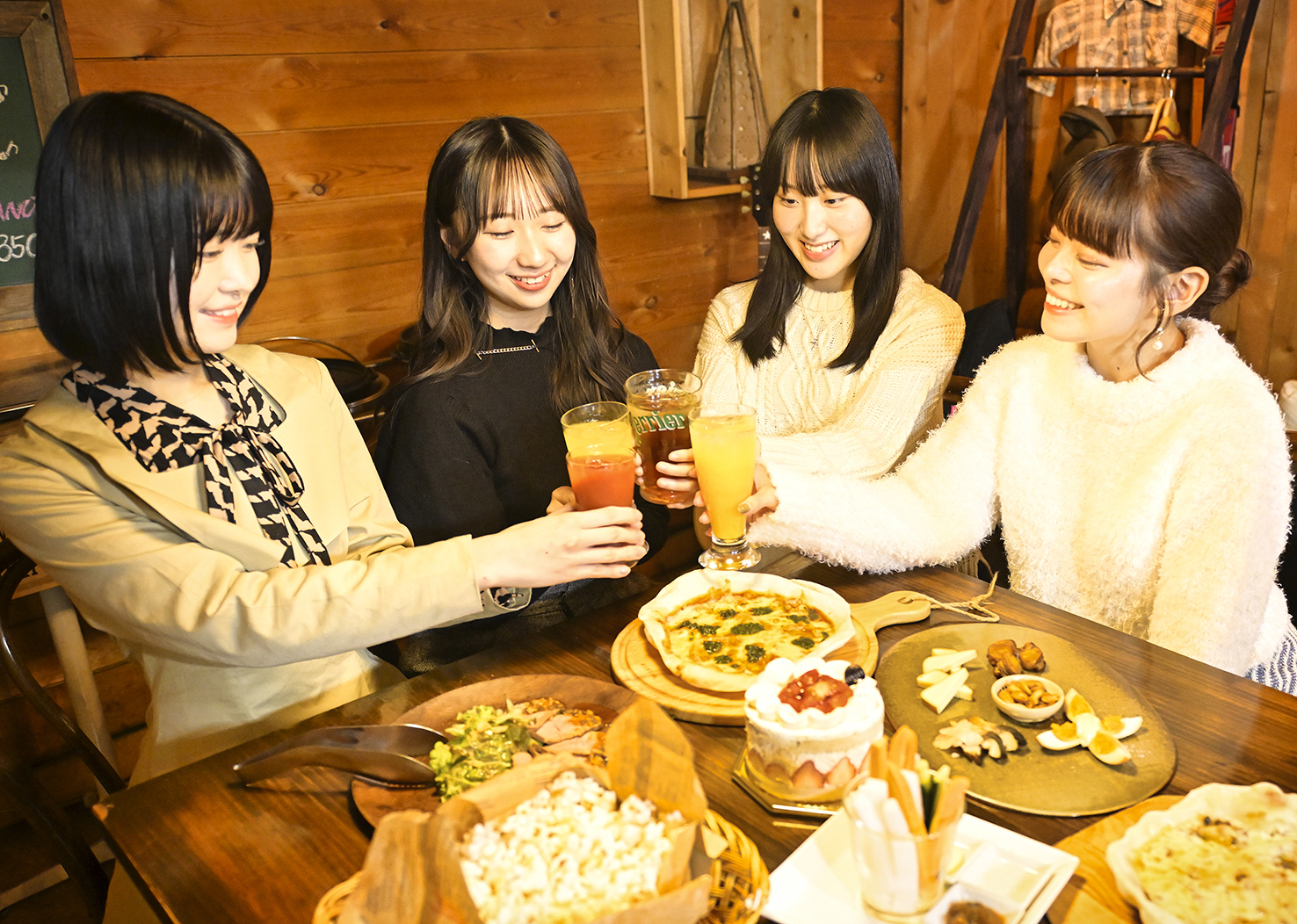 今回の特別編で撮影場所を提供してもらったのは「CURTAIN CALL」(札幌市中央区南3西4)です。カントリーミュージックやジャズが流れる店内は、ライブ会場としても使用されているほど広々としたスペース。メンバーも興味津々に店内を見て回っていました。料理、ドリンクの種類も豊富で、この日はピザやローストビーフ、パスタなどをいただいていました。