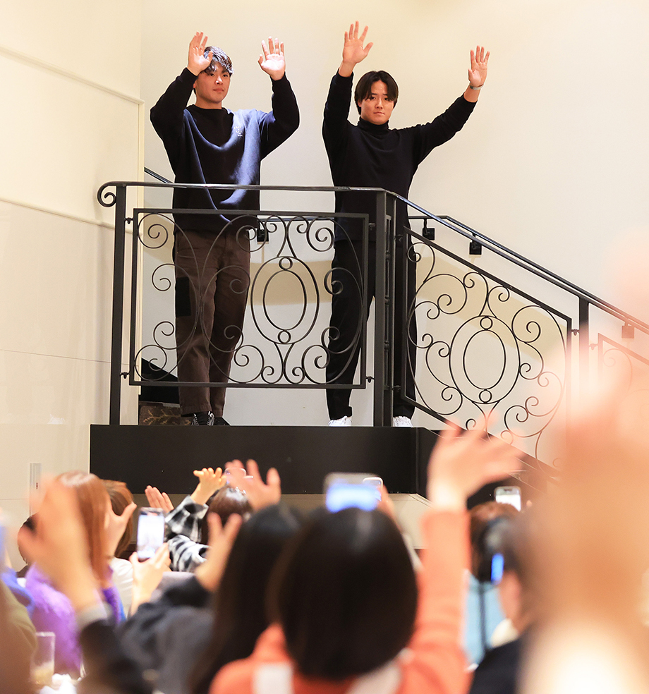 イベント終了後、見送るファンに手を振る郡(右)と野村
