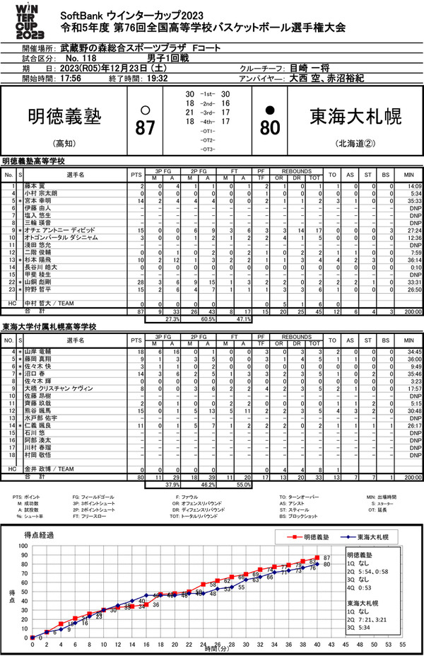 ▽男子1回戦 明徳義塾(高知)87-80東海大札幌高