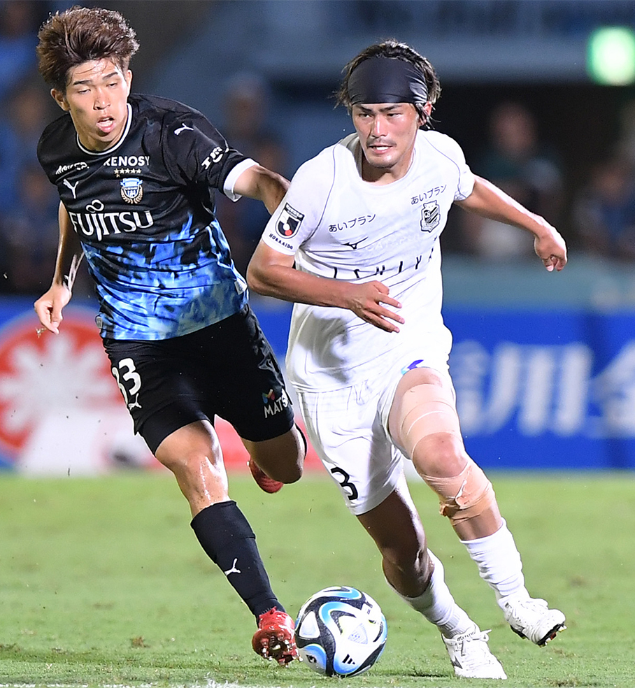 8月26日のアウェー川崎戦、自陣からドリブルで駆け上がるDF馬場(右)