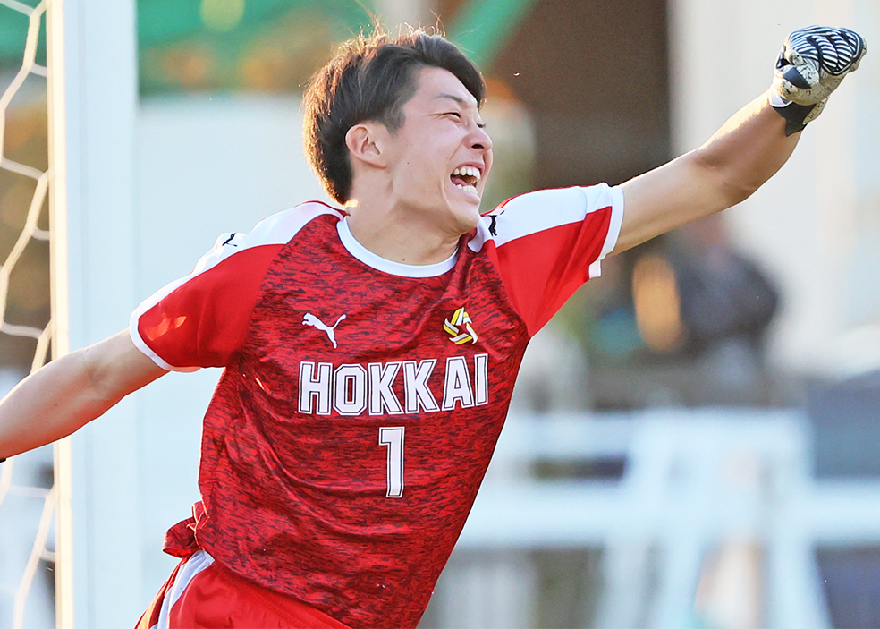 北海の6人目のキッカーを務めたMF成澤晏士(3年)がゴールポストに当てながらもシュートをゴールへとねじ込み、全員成功のまま迎えた後攻、大手前高松の6人目。「(PKの)練習は結構やってきていたので、相手を見て、できるだけ動かずに、しっかりボールに反応することを意識していました。自分の思った方向を信じて、思い切って飛べたかなと思います」と語る小野寺が、ゴール左下へのシュートに反応し、見事にはね返して見せた。「去年、一昨年と、自分の目の前で先輩たちが悔し涙を流してきて、先輩たちのその気持ちもしっかり背負って全国で勝てた。全国で勝つというのも自分たちの一つの目標だったので、すごくうれしいです」と満面の笑みを見せた。