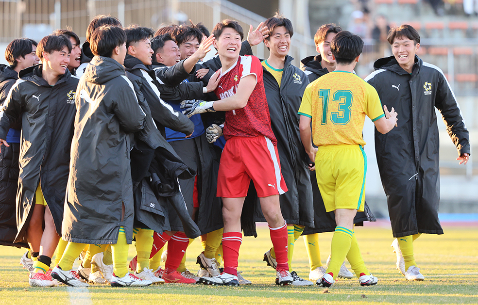 PK戦で勝利を決め、北海GK小野寺(中央)を中心に歓喜の輪が広がる