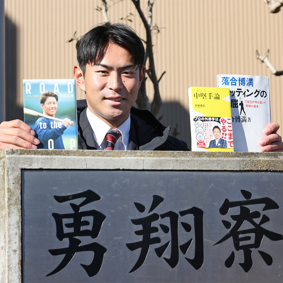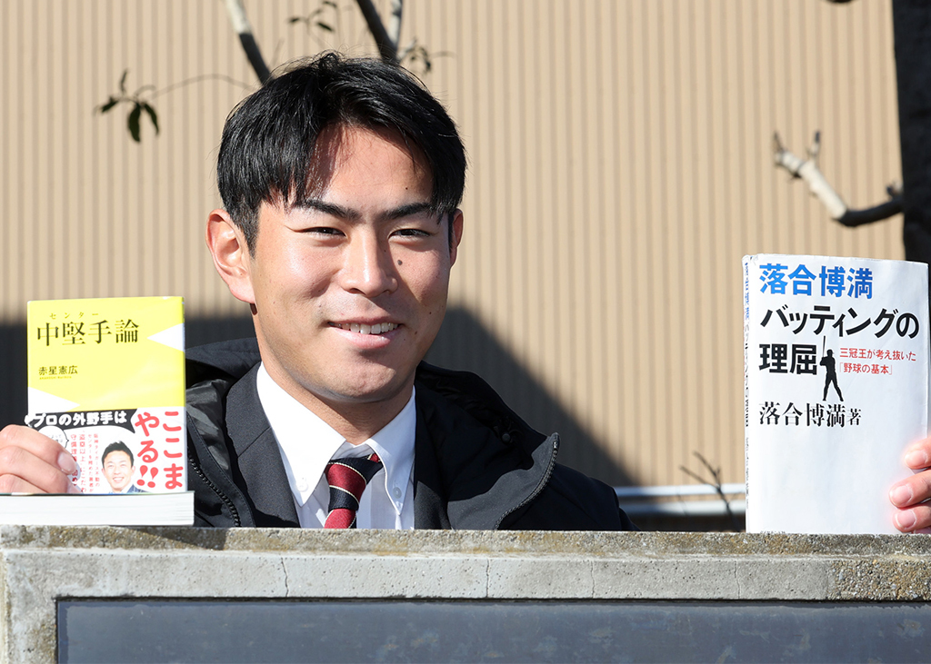 野球本を3冊、持参した。中でも「右バッターで一番すごい選手だと思う」と尊敬する落合博満氏の著書「落合博満 バッティングの理屈」には年季が入っている。高校時代に初めて同著に出会い「一つ一つ、面白いことが多くて『ここまで考えるのか』ということばかりだった。バッティングは奥深い」と衝撃を受けた。以降は繰り返し熟読し〝オレ流〟の極意を頭に叩き込んだ。