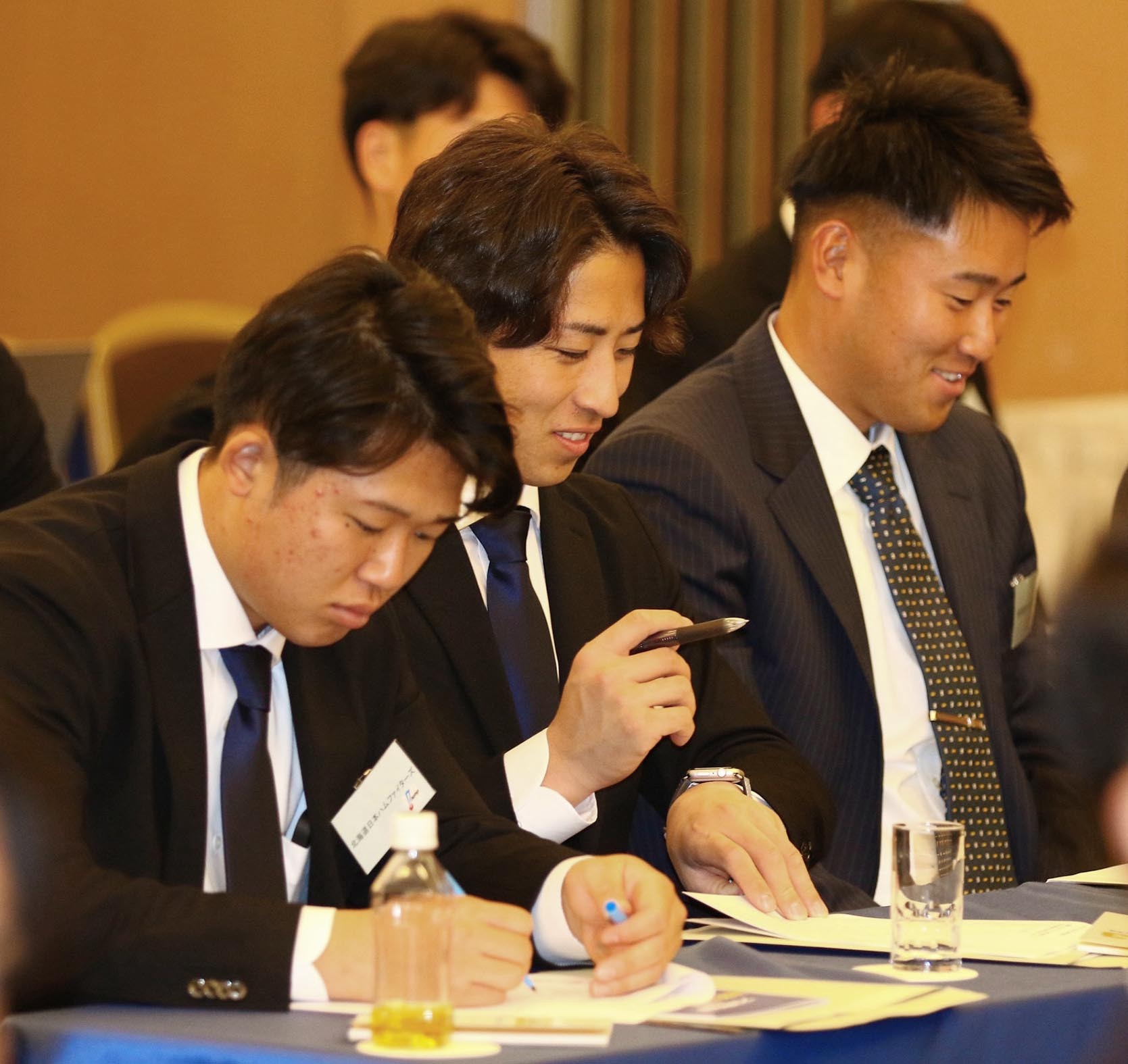 NPB新人選手研修会に出席した細野(中央)=撮影・榎本真之