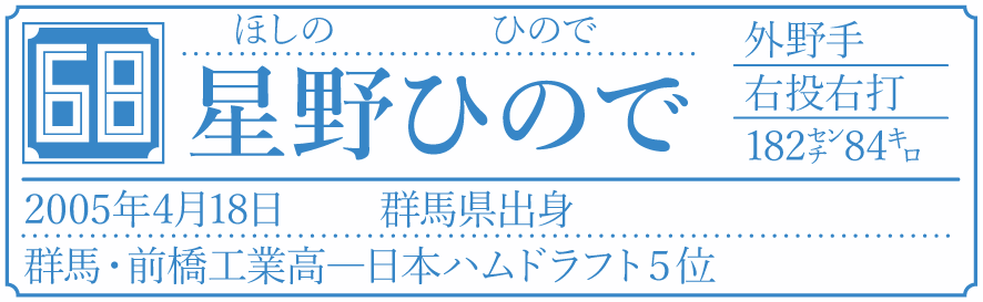 2024年、支配下と育成を合わせて9人のルーキーが日本ハムに入団した。将来性豊かな大型左腕、世代NO1捕手、伸びしろ十分な高卒新人5選手など、ユニークな顔ぶれが揃った。U18台湾代表の孫易磊(スン・イーレイ)投手(18)もドラフト外で加わった。道新スポーツデジタルでは、2月1日から始まる春季キャンプを前にオリジナルの新人名鑑を作成。基本情報にプラスして、軟らかい話題を多く取り入れた「10の質問」に答えてもらった。5人目はドラフト5位の星野ひので外野手(18=前橋工高)。