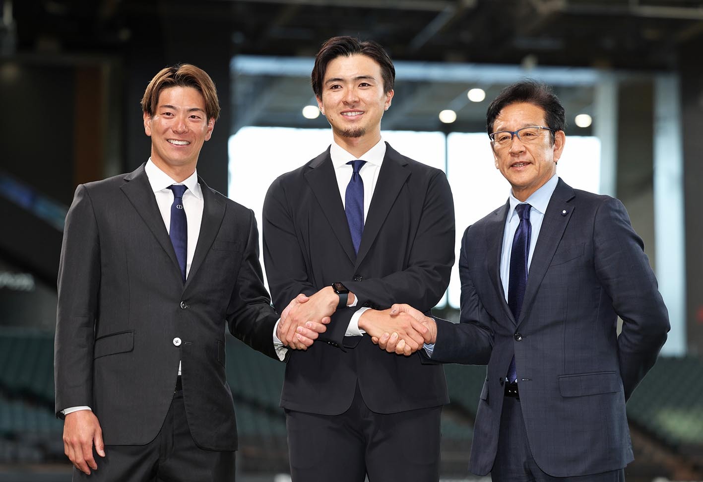 フォトセッションに応じた(左から)栗山CBO、上沢、松本剛