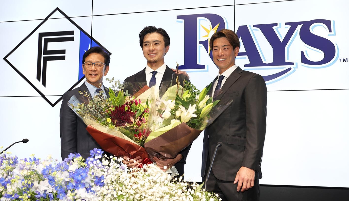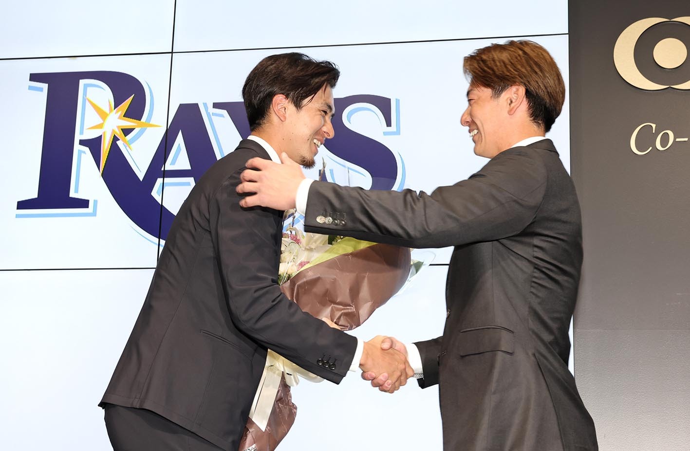 日本ハムの松本剛外野手(30)が19日、エスコンフィールド北海道で行われた上沢直之投手(29)の記者会見にサプライズ登場。合同自主トレを行う沖縄・伊江島から急きょ駆け付け、レイズとマイナー契約を結んだドラフト同期の門出を祝った。