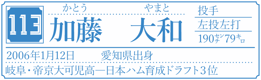 2024年、支配下と育成を合わせて9人のルーキーが日本ハムに入団した。将来性豊かな大型左腕、世代NO1捕手、伸びしろ十分な高卒新人5選手など、ユニークな顔ぶれが揃った。U18台湾代表の孫易磊(スン・イーレイ)投手(18)もドラフト外で加わった。道新スポーツデジタルでは、2月1日から始まる春季キャンプを前にオリジナルの新人名鑑を作成。基本情報にプラスして、軟らかい話題を多く取り入れた「10の質問」に答えてもらった。8人目は育成ドラフト3位の加藤大和投手(18=帝京大可児高)。