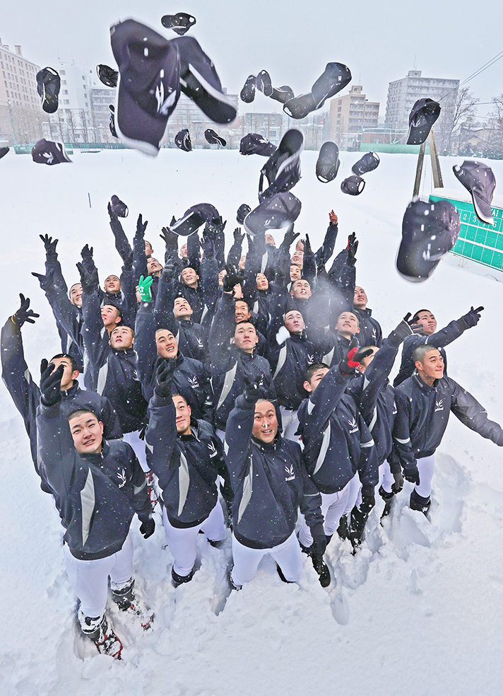 センバツ出場の知らせを受け、帽子を投げて喜びを爆発させる北海ナイン=撮影・宮永春希