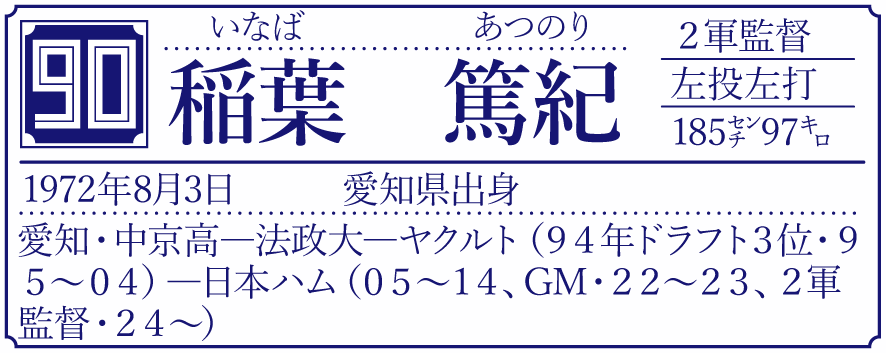 道新スポーツデジタルでは、日本ハムの沖縄春季キャンプに合わせて「新コーチに聞く」を不定期連載する。2024年に就任したコーチングスタッフを紹介。大切にしている言葉や信念、影響を受けた指導者、キャンプ中の失敗談、オススメの息抜きなど、いくつかのテーマに沿って答えてもらった。第3回は現役最終年以来10年ぶりにユニホームを着る稲葉篤紀2軍監督(51)が登場する。