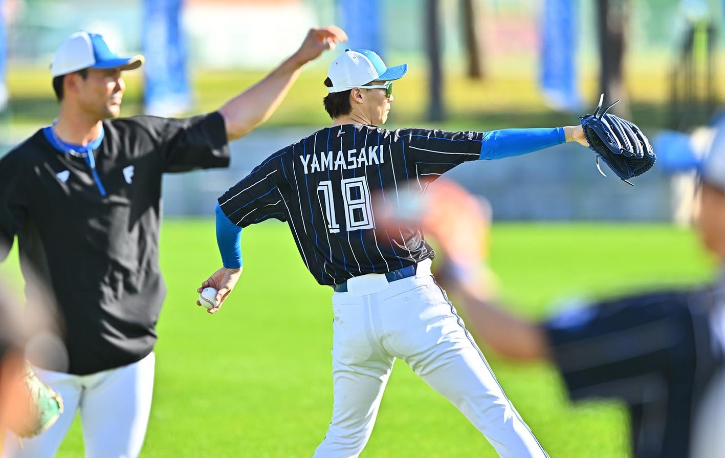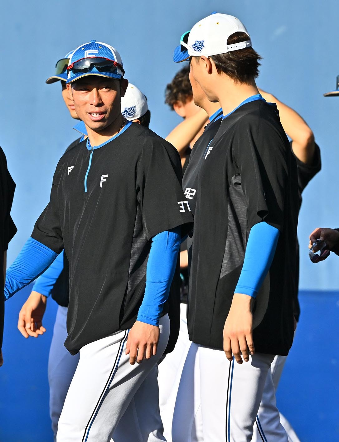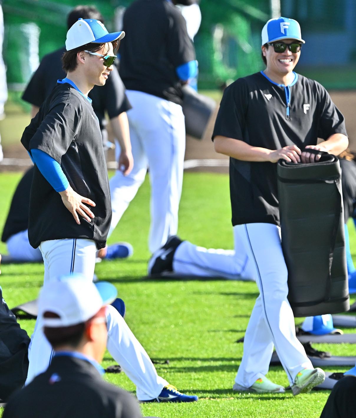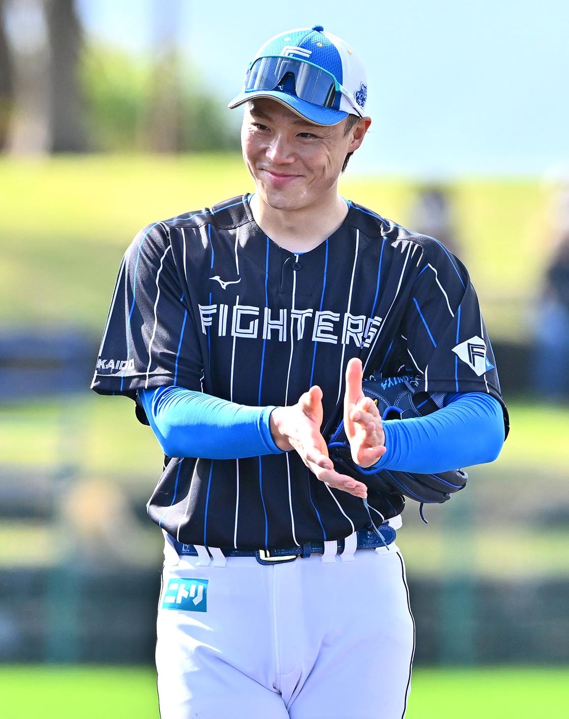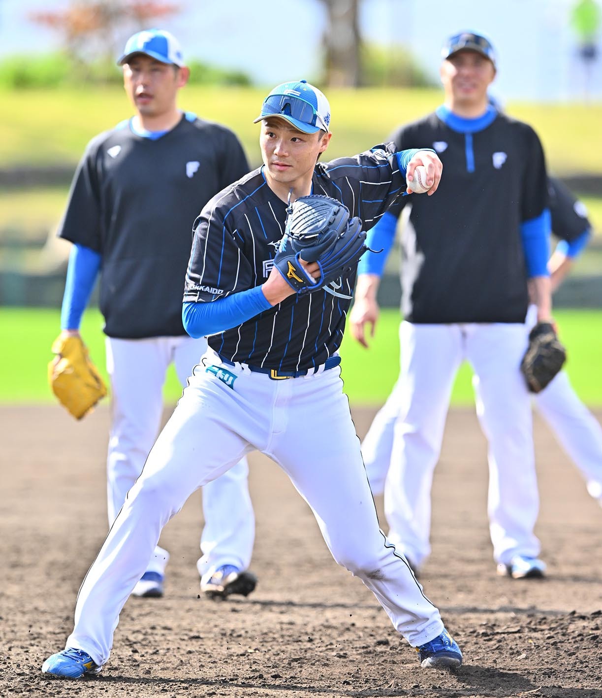 10:10 サブグラウンドで行われたPFP(投内連携)では、軽快なフィールディングを披露。新たなチームメートと、楽しげなムードを漂わせた。「やりやすい雰囲気があるのは前から分かっていた。そういうのも含めて、ファイターズはいいなと思って決断したので。予想通り、本当にやりやすい環境だなと思いました」