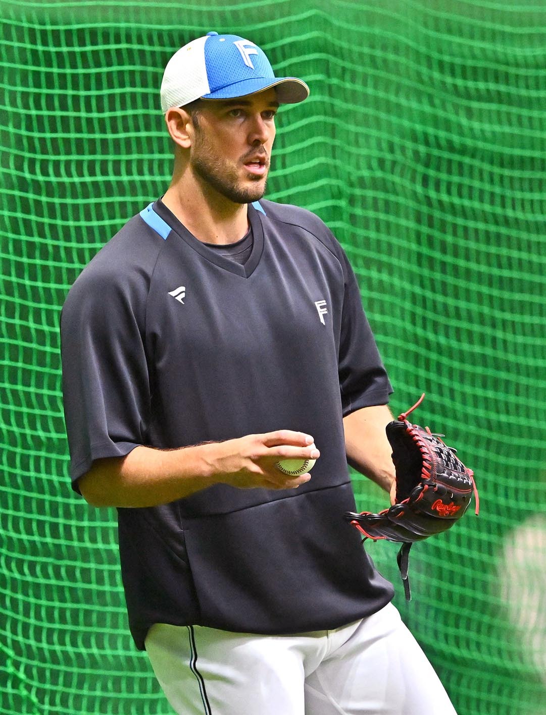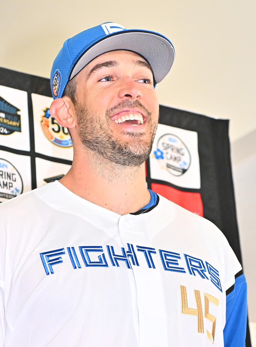 「まずは本当にうれしく思いますし、新鮮な気持ちです。前回いた時とユニホームは変わっているんですけど、新しいカラーで、自分自身このユニホームは本当に好きなので、このユニホームに袖を通すことができて本当にうれしく思います。まずはエスコンフィールドでユニホームを着てプレーすることを楽しみにしています。本当に楽しみな気持ちでいっぱいです」