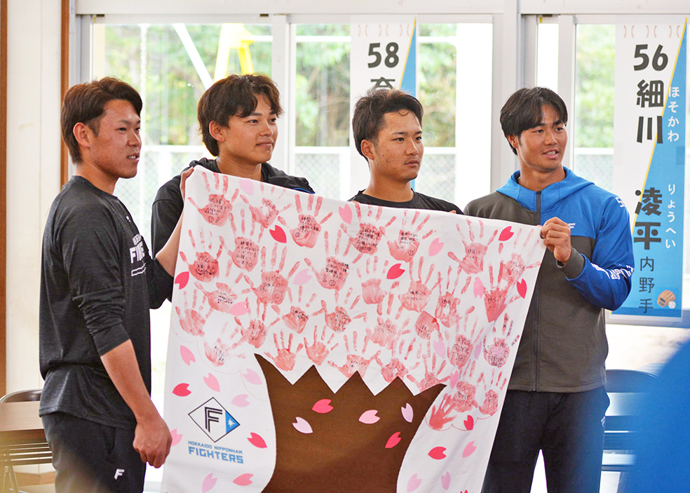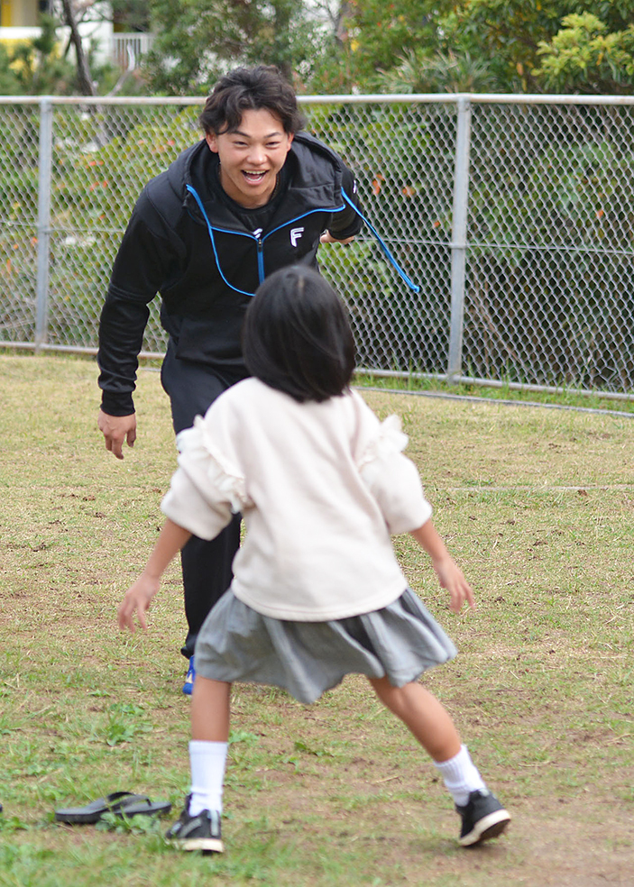 日本ハムの田宮裕涼捕手(23)、奈良間大己内野手(23)、細川凌平内野手(21)、根本悠楓投手(20)が、春季キャンプ最初の休日となった5日に、沖縄・名護の児童養護施設「なごみ」を訪問した。