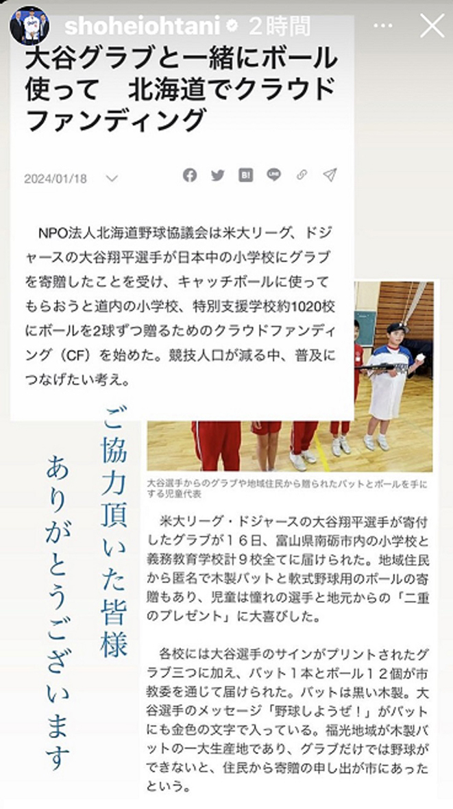 すると、同24日に大谷がグラブのプレゼントを報じる記事と同協会のクラウドファンディングの告知に「ご協力頂いた皆様、ありがとうございます」と感謝の言葉を添えてSNSでアップ。直前まで33万9000円だった支援額は、翌日には全国各地から集まり50万円を突破。その後も勢いは衰えることなく、目標の150万円達成へ順調なペースで支援者が増加している。2月8日午後6時時点の支援者は113人、126万6000円。中日の道産子・竹内龍臣投手(22)からも最高額の10万円の寄付があったそう。