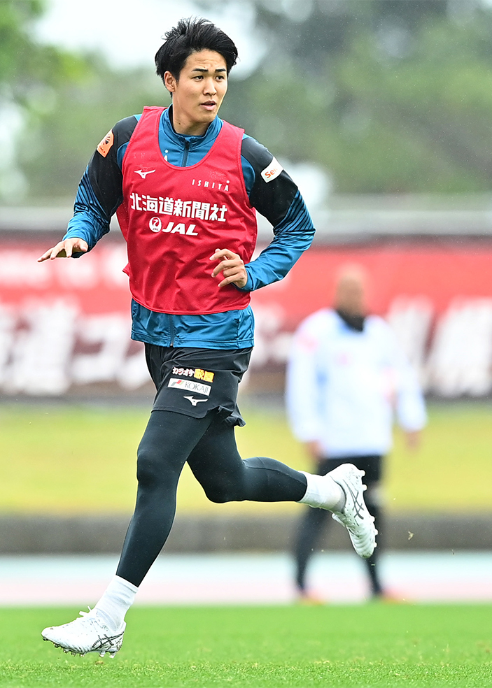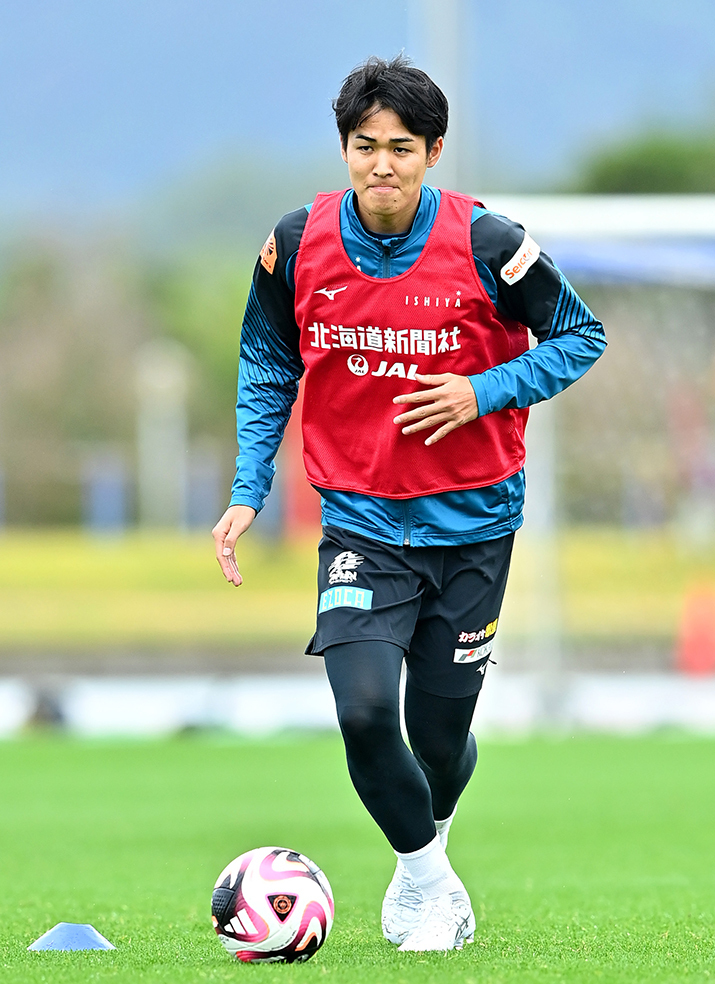 約3週間ぶりに沖縄のピッチを駆け抜けた髙尾。戦術練習では3バックの右に入り、パス交換しながら何度もゴール前へ迫った。「やっぱサッカーするの楽しいというか、気持ちいいっす。サイドバックでずっとやってきたんで、前に行く力は今のチームの中では一番あると思います。ボールを持ちながらでも長いロングスプリントもできる」。昨季まで不動の3バックの右を務めたDF田中駿汰(26)の移籍で勃発したポジション争いを、新たな背番号2が奪い取る。