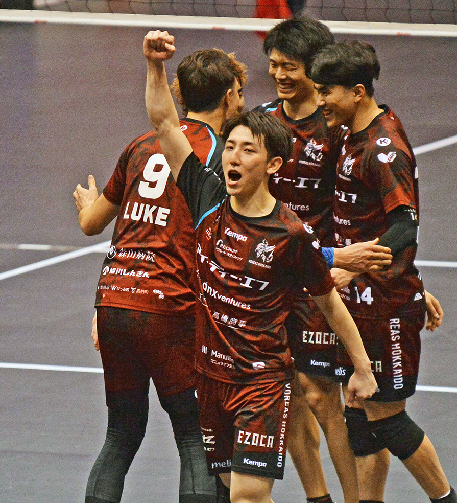 チームの得点を喜ぶヴォレアス北海道のS山岸(手前中央)