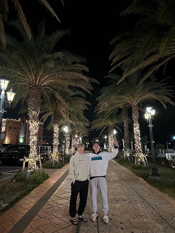 2月の沖縄遠征時に島谷選手(左)と記念撮影する松下(松下選手提供)