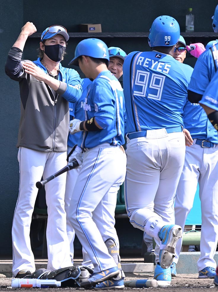一回2死一塁、レイエス(背番号99)が2点本塁打を放ち、新庄監督(左)も笑顔で迎える=撮影・小田岳史