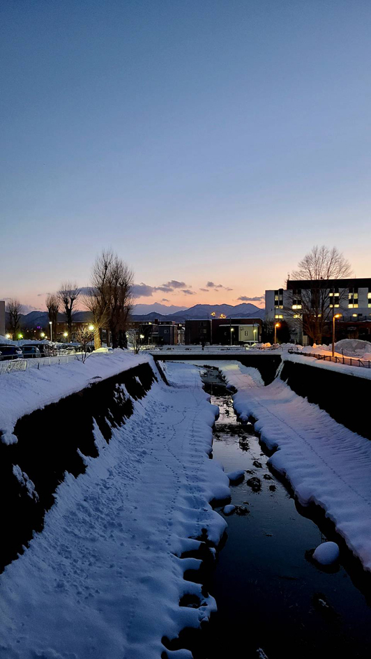 実家の近く。川の先には小さくですがナイター営業のスキー場が見えます。