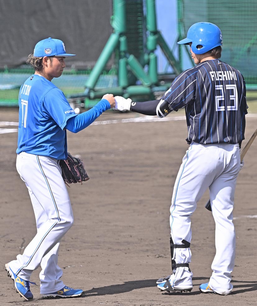 実戦形式の登板を終えた伊藤(左)とグータッチを交わす伏見