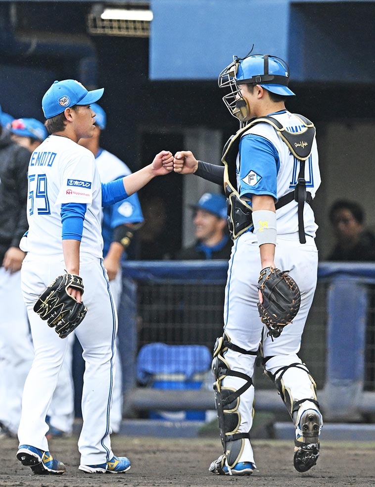 3回を無失点に抑え、清水(右)とグータッチを交わす根本