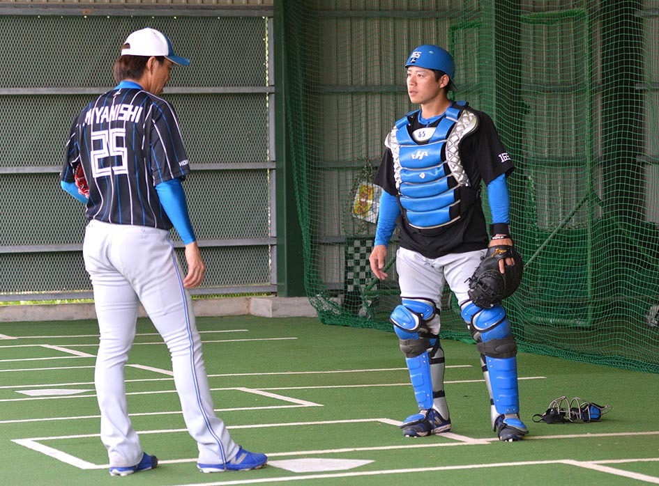 後輩に話を聞くと「試合に向けて、チェンジアップをどういうところで使うかという話をしていました。チェンジアップは落ち幅も結構あるので、宮さん(宮西)から右打者と左打者で、構える高さをこうしてほしいという話がありました。あと僕は、構える時に右足を着いたり、左足を着いたりして、ななめに構えることもあるんですけど、宮さんには真っすぐ構えてほしいと言われました。ななめの方が取りやすいですけど、もちろん投手優先。そうやって言ってもらえることはありがたいです。他にも膝を着いた時のミットの高さと、膝を上げた時のミット高さが変わらないようにとか、いろいろな話をしていただきました」と教えてくれた。