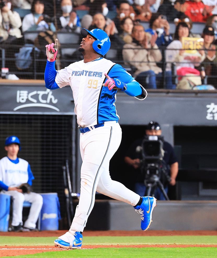 新加入の大砲が、チームの〝2024年エスコン1号〟を叩き出した。逆方向への一撃を振り返った背番号99は「これが俺の本来の形だよ。ここはテキサスレンジャーズのスタジアムに似ている印象。今までいろんなチームでプレーしてきたけど、それを超える環境がある。この球場を造っていただいた地域の方に感謝したい」と、あいさつ代わりのアーチを描き、とびきりの笑みを浮かべた。