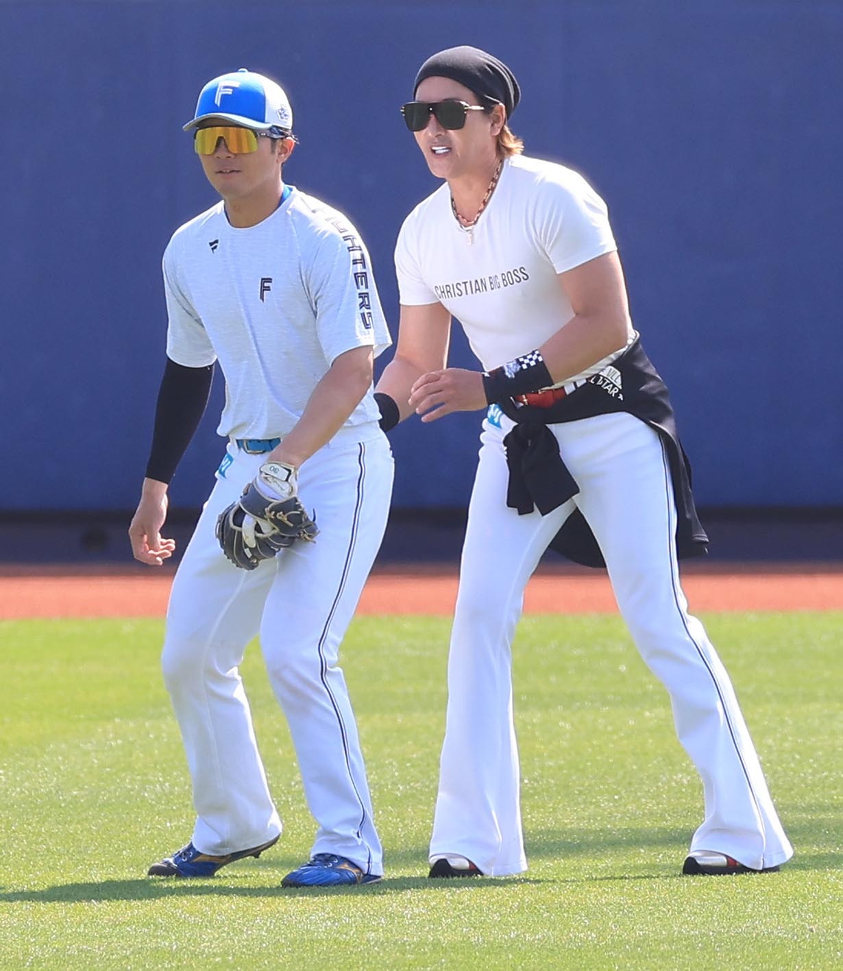 2月の春季キャンプで新庄監督(右)から外野守備の指導を受ける郡司