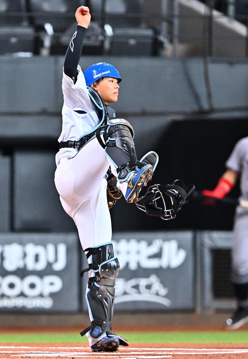 四回からは先発ローテーション争いを繰り広げる北山をリード。「北山さんのいい球を生かして、きょうは真っすぐを軸に、だんだんイニングを重ねるごとに変化球を交ぜたり、バッターに的を絞らせないようにしました」。1イニング目はほぼ直球一本で押し、七回までマスクを被った。