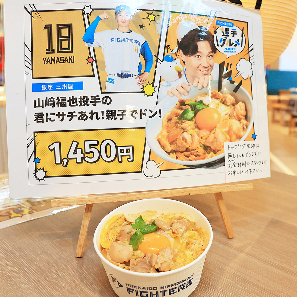 新作グルメで、堂々の人気ナンバーワンはこちら。商品名には父・章弘さんも日本ハムOBという思いも込められおり、オリックスからFA加入したイケメン左腕が上目遣いをしているポップも目を引く。