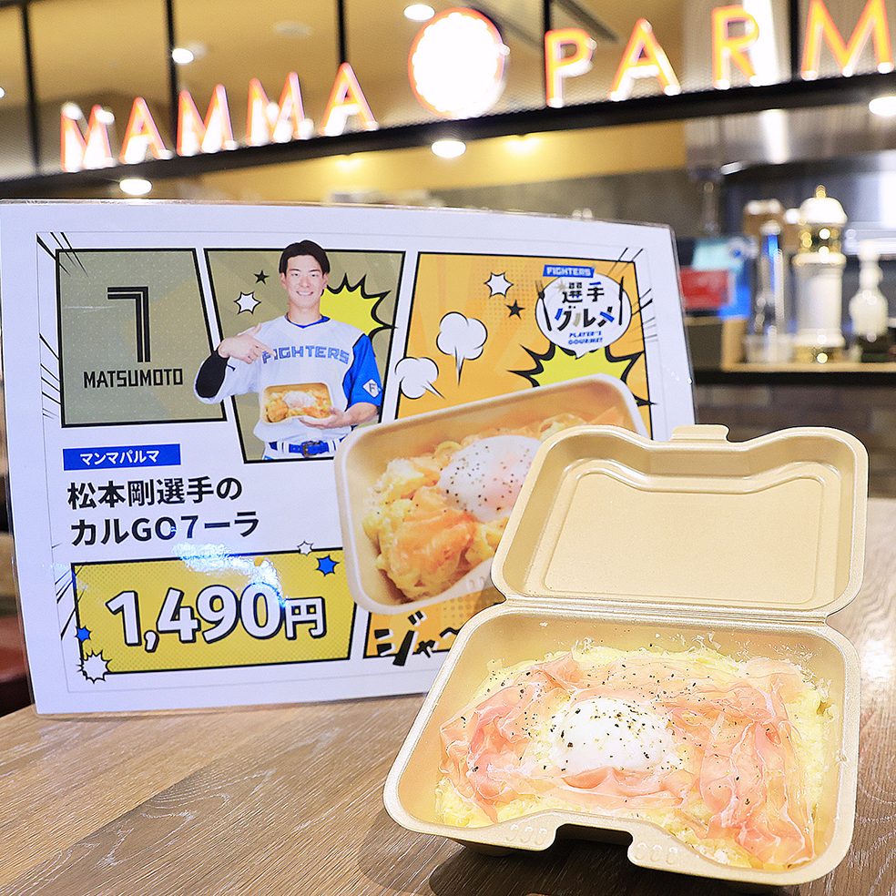 カルボナーラは選手会長の好物だそう。もっちもちの平打ち麺に、イタリア産チーズのパルミジャーノ・レッジャーノがどっさり。藤井純一元球団社長が海外から買い付けたという生ハムがアクセントとなっており、ボリューミーな一品に仕上がっている。