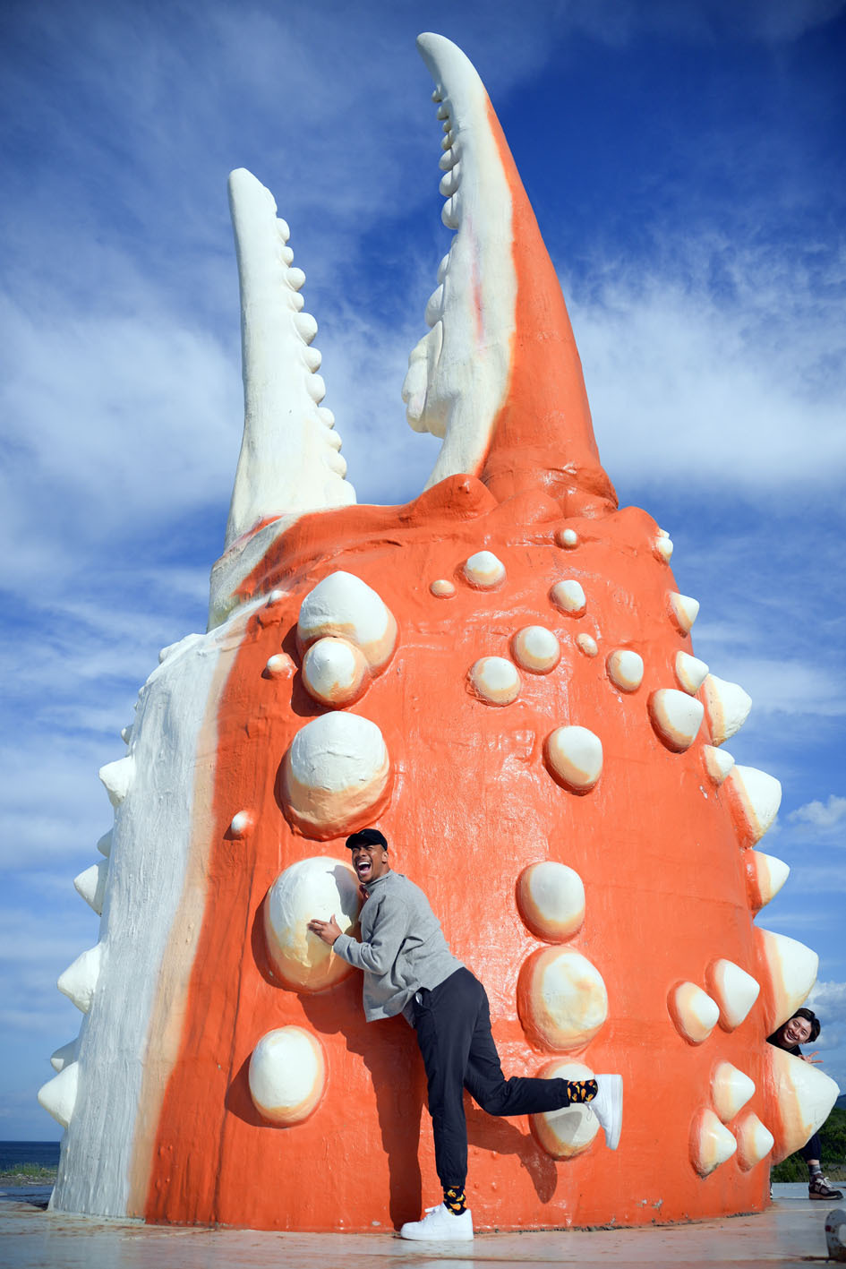 紋別のシンボル「カニの爪」のオブジェの前で満面の笑顔。右奥は一緒にホタテの殻むきを体験した松下裕汰選手=2023年6月、レバンガスタッフ撮影