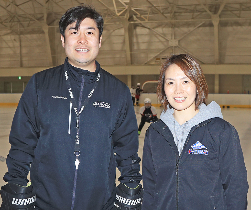 初代スマイルジャパンの平野さん(右)は、スポーツマネジメント会社代表として、カナダでプレーする磯谷建汰選手(左)の活動をサポートする=提供写真