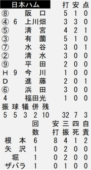 0―2の六回、2四球と4番・有薗直輝内野手(20)のヒットで満塁の好機をつくり、続く水谷瞬外野手(23)の右犠飛で1点差とした。さらに2死満塁と攻め立て、8番の進藤勇也捕手(22)の押し出し死球で試合を振り出しに戻した。2―2の七回には1死二塁で、3番の清宮幸太郎内野手(24)がセンターに勝ち越しタイムリーを放った。