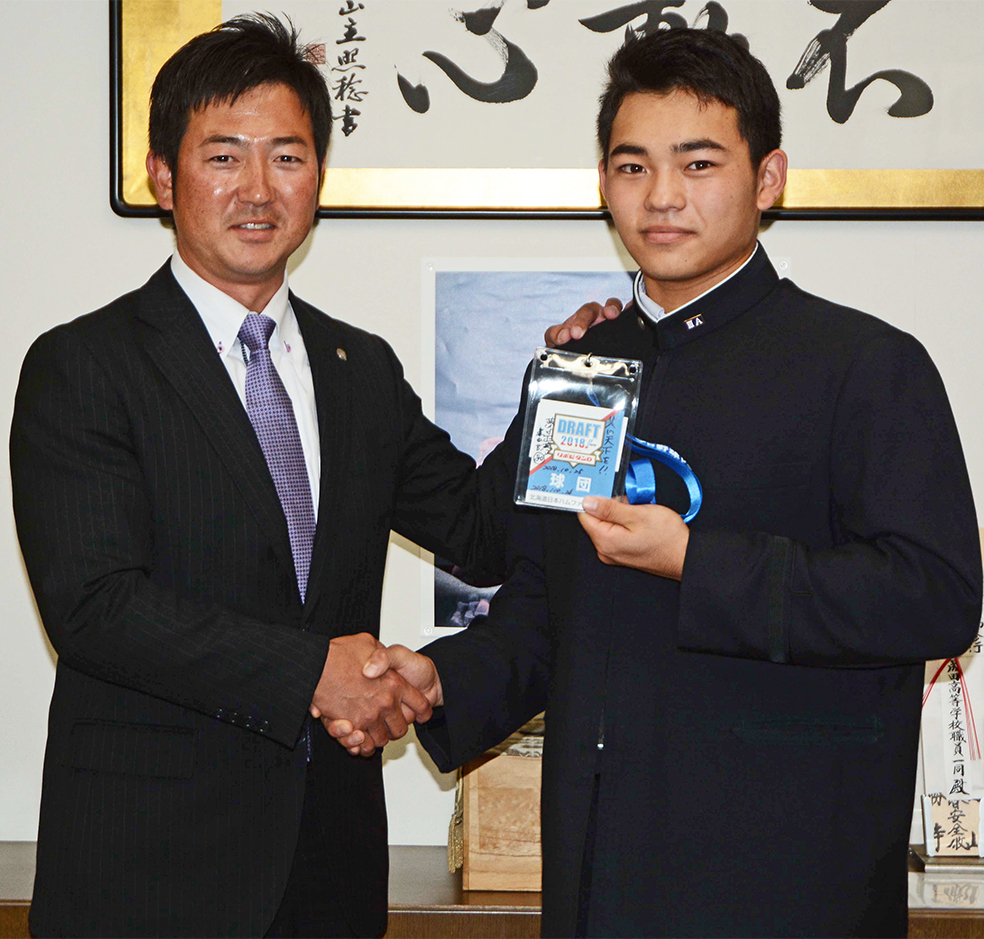 2018年10月31日 高校の先輩でもある岩舘スカウト(左)から指名あいさつを受けた田宮