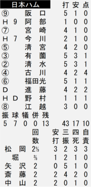 四回には再び大量3点を奪取した。1死から3連打で満塁とし、古川が押し出し四球。2死満塁から8番の進藤勇也捕手(22)が中前に2点打を放った。八回には2死三塁で代打登場した野村佑希内野手(23)が中前にはじき返し、1点を加えた。九回には有薗と清水に適時二塁打が飛び出した。