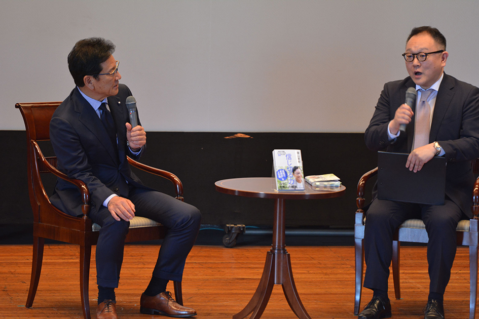 有隣堂・松信社長(右)とスペシャル対談を行った栗山CBO=撮影・近藤裕介