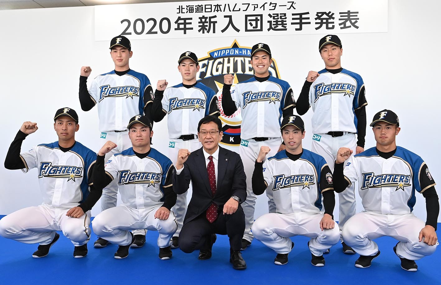 2020年の新入団選手発表で並んで写真に収まる(前列右から)細川と五十幡