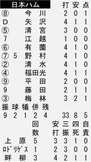 0―0の七回、一気に試合を決めた。4番の有薗直輝内野手(20)からすべて単打で6連打。福田光輝内野手(26)、藤田大清外野手(19)、梅林優貴捕手(26)のタイムリーで3点を奪取。さらに1番・今川優馬外野手(27)の右犠飛と矢沢宏太投手兼外野手(23)の二ゴロの間に加点した。