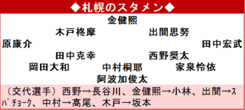 前半は札幌が押し気味にゲームを進めた。左ウイングバックの高卒ルーキーMF原康介(18)は何度もドリブル突破を見せ、攻撃を活性化させた。すると10分、その原がペナルティーエリア内左でパスを受けて中央へクロスを送り、FW金健熙(29)が鋭い右足シュート。相手GKが弾いたボールをMF田中宏武(25)が詰めて押し込み、プロ初得点となるゴールで先制した。