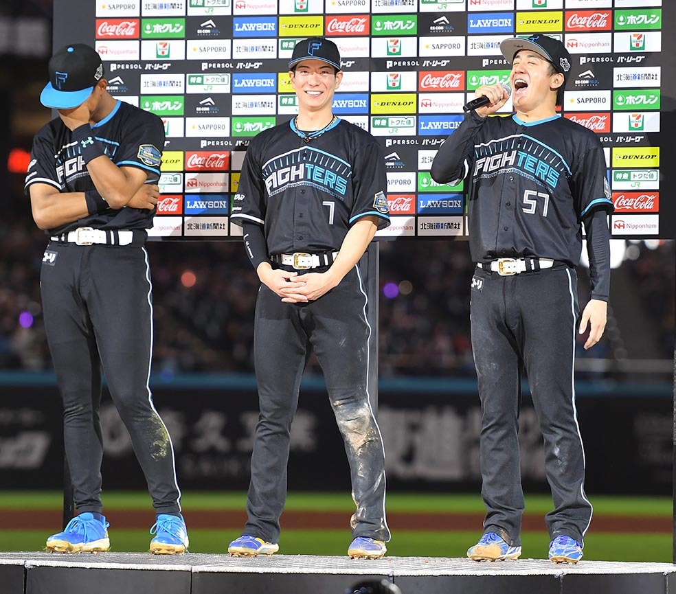 ヒーローインタビューで“さいこーき!”と叫ぶ北山(右)と笑顔の万波(左)、松本剛(中央)