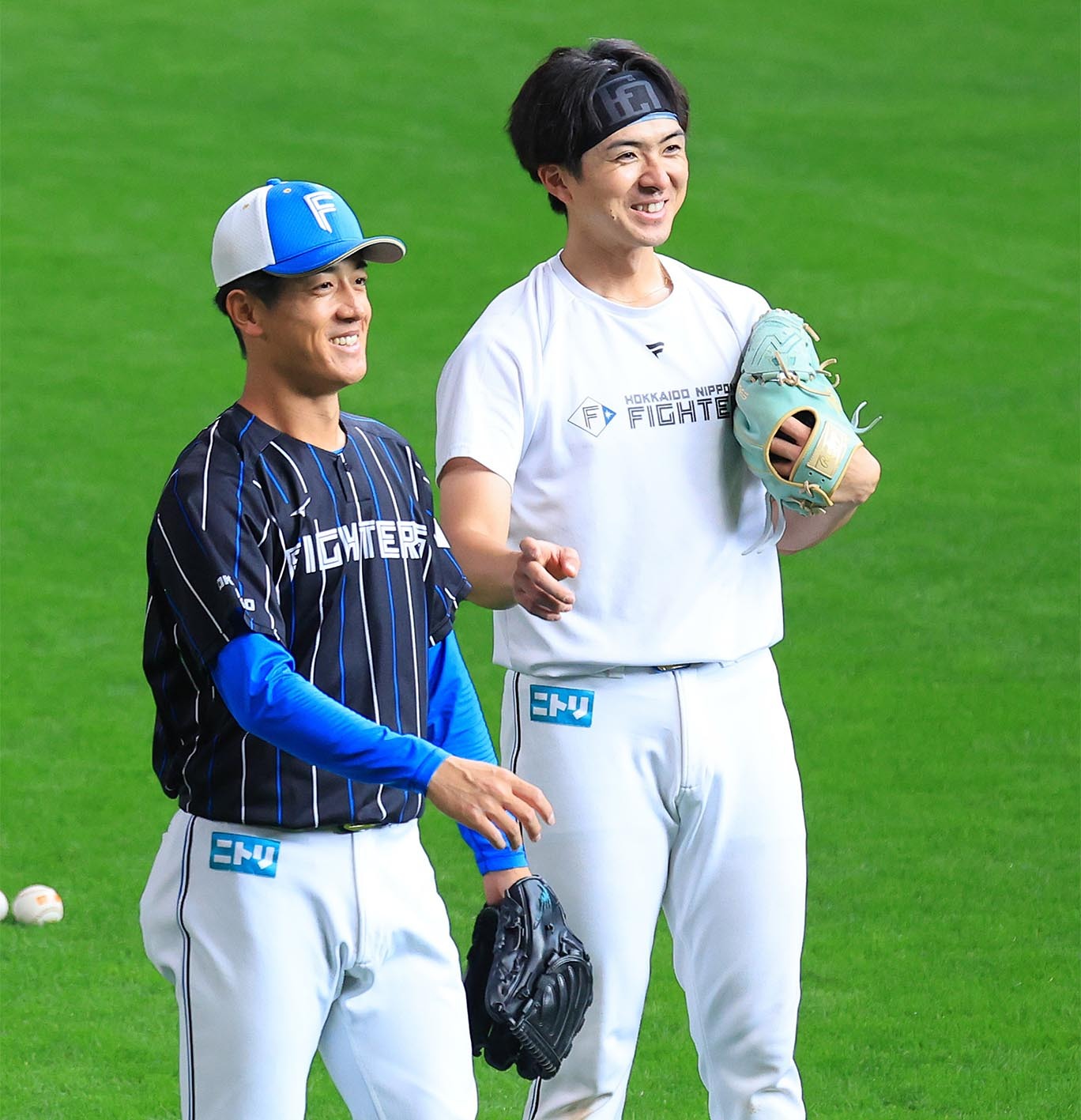 2023年11月の秋季キャンプで笑顔の北山(左)と上沢